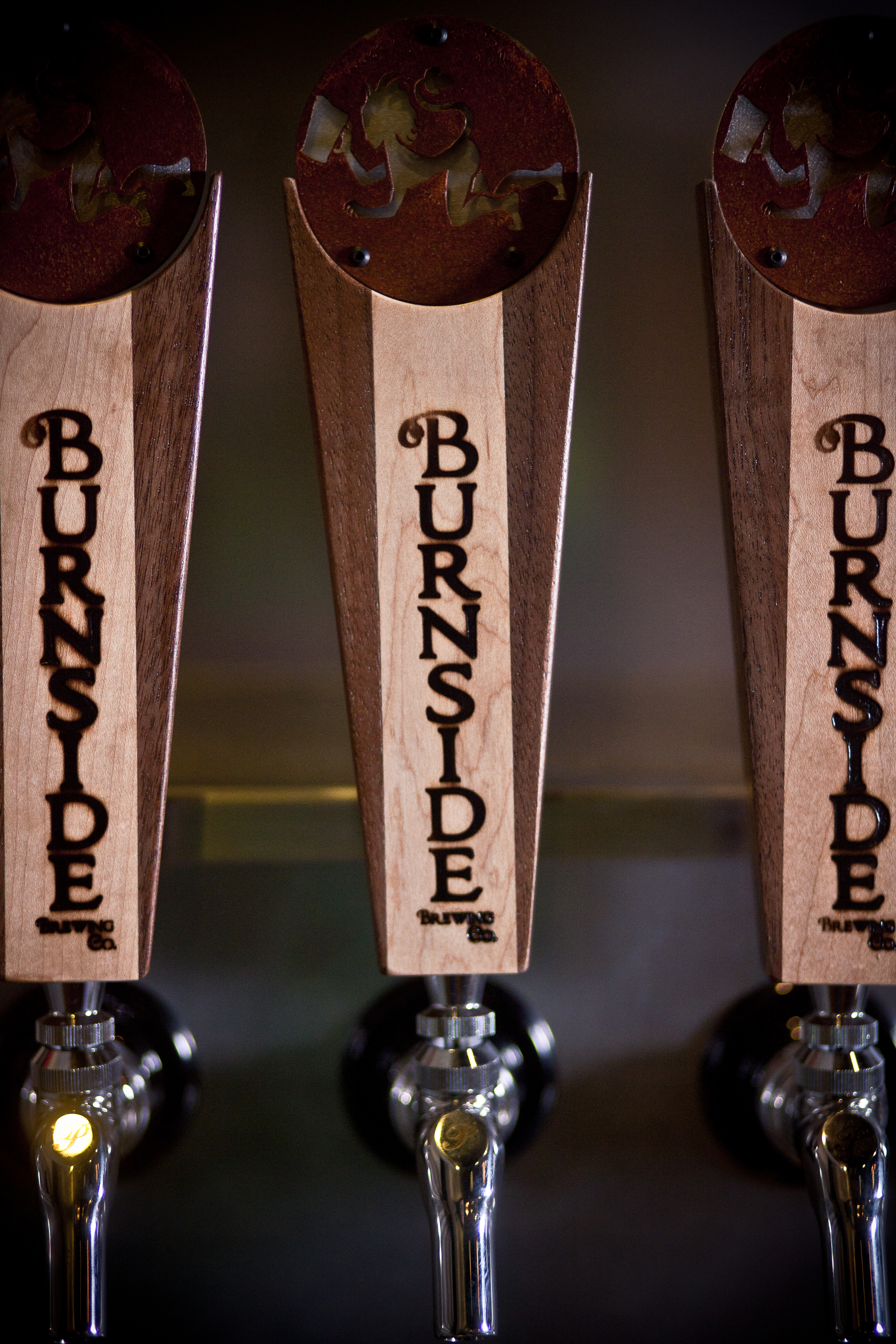 A photograph of Burnside Brewing Company's original tap handles shows three of them fitted on to beer faucets. "BURNSIDE" in dark lettering displays prominently and vertically on the handle made of contrasting light and dark wood. The nymph logo is hard to see in this photograph, but is cut out of a round piece of metal attached to the top of the handle.